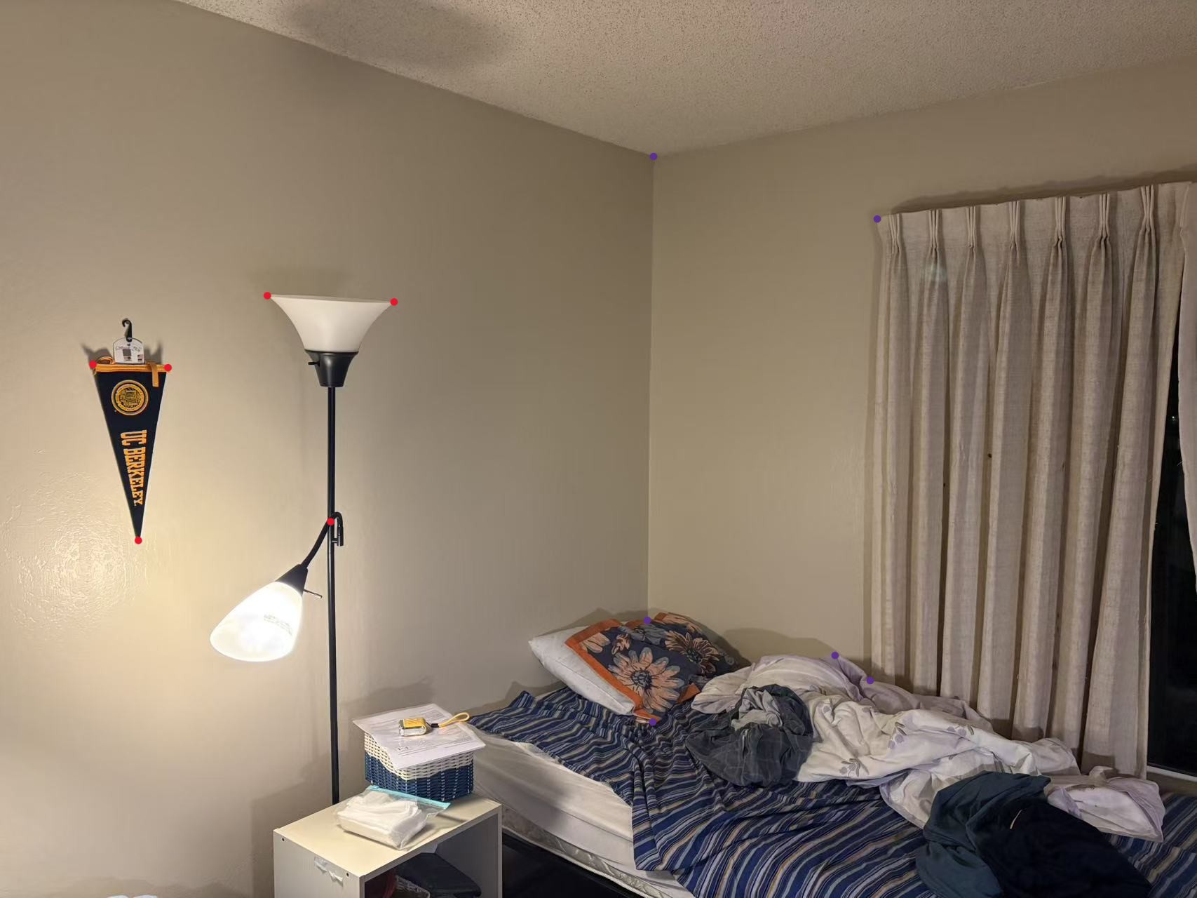 The correspondence points are marked in the figures. Red Points: Left two pictures; Purple Points: Right two pictures