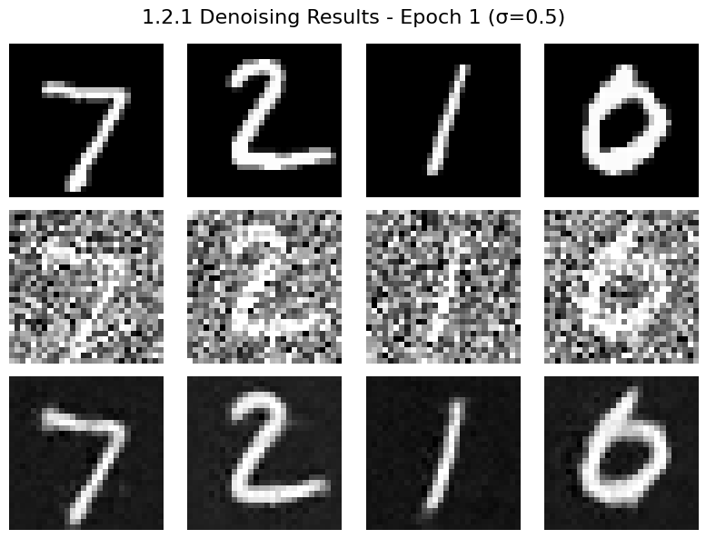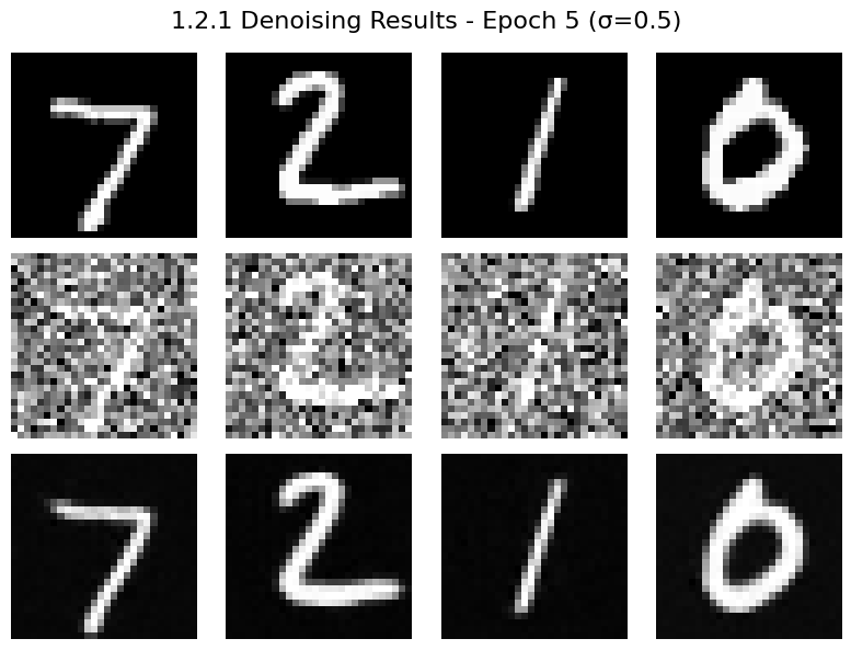 Deliverables: Sample results on the test set with noise level 0.5 after the first and the 5-th epoch