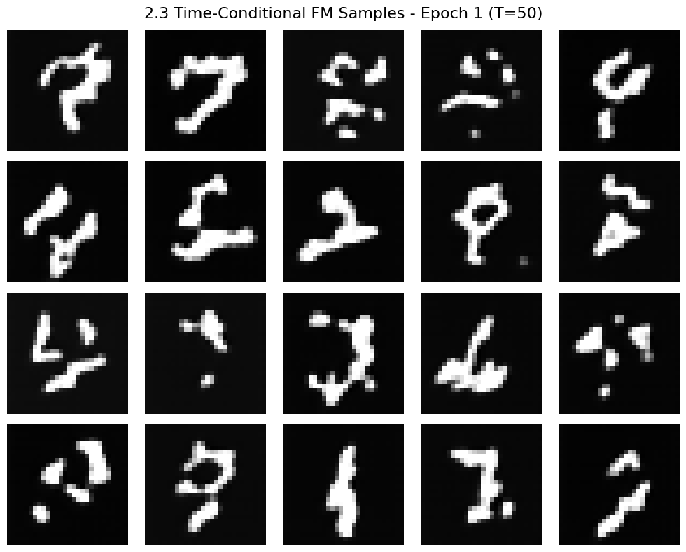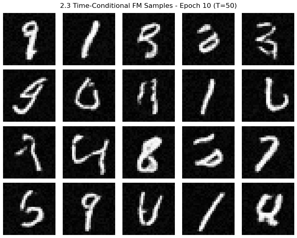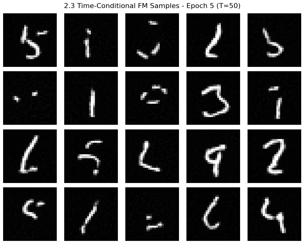 Deliverables: Sampling results from the time-conditioned UNet for 1, 5, and 10 epochs. The results should not be perfect, but reasonably good.